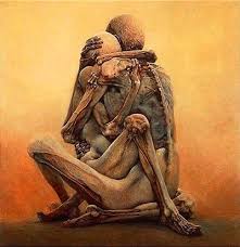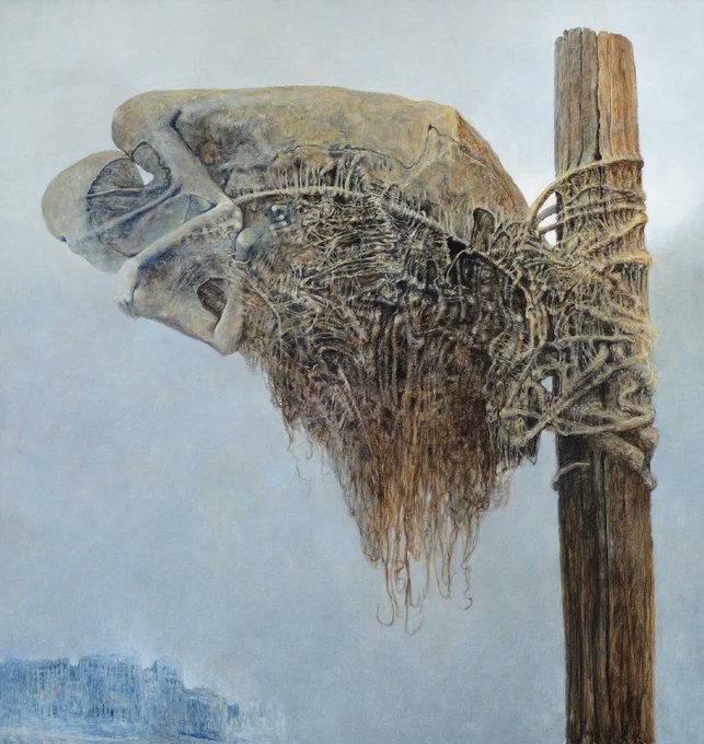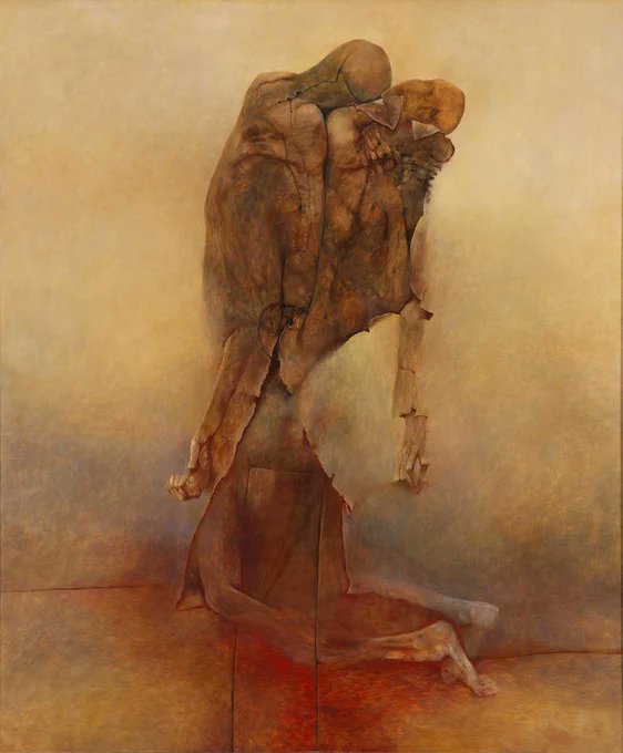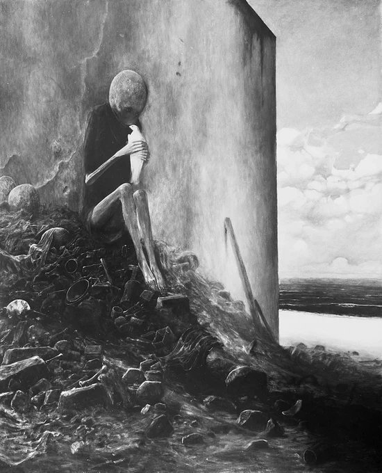البولندي جيزلاف بيكشينسكي.. بنى أغلب لوحاته على لوحاته إن:"إن الموت حياة دائمة، يعني الإنسان ينتقل لمرحلة أخرى، الجميع هناك سواسية، لذا كان يمحي أية ملامح أو مظاهر غنى أو فقر على شخوص لوحاته"(1)