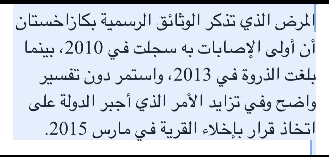 🛑 النهاية عام2020 طرح علماء من جامعة نزاربايف برئاسة البروفيسور بايرونوم فرضية لتفسير ما حدث لأهل القرية حيث وصلوا إلى استنتاج أن الماء سممته على الأرجح مواد كيميائية عن طريق منجم اليورانيوم لا يمكن التأكيد إلا بالذهاب للمنجم الخطير وأخذ عينات التربة والماء ويعد مكان خطير…