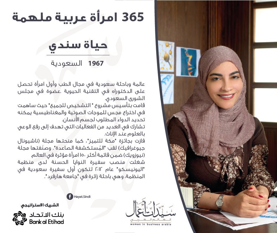 #السعودية د/حياة سندي سعودية فكت شفرة السرطان وساهمت في اختراع مجس للموجات الصوتية والمغناطيسية يحدد الدواء المطلوب لجسم الإنسان ، اختارتها الخارجية الأمريكية ضمن أفضل عالمات العلوم لعام 2014