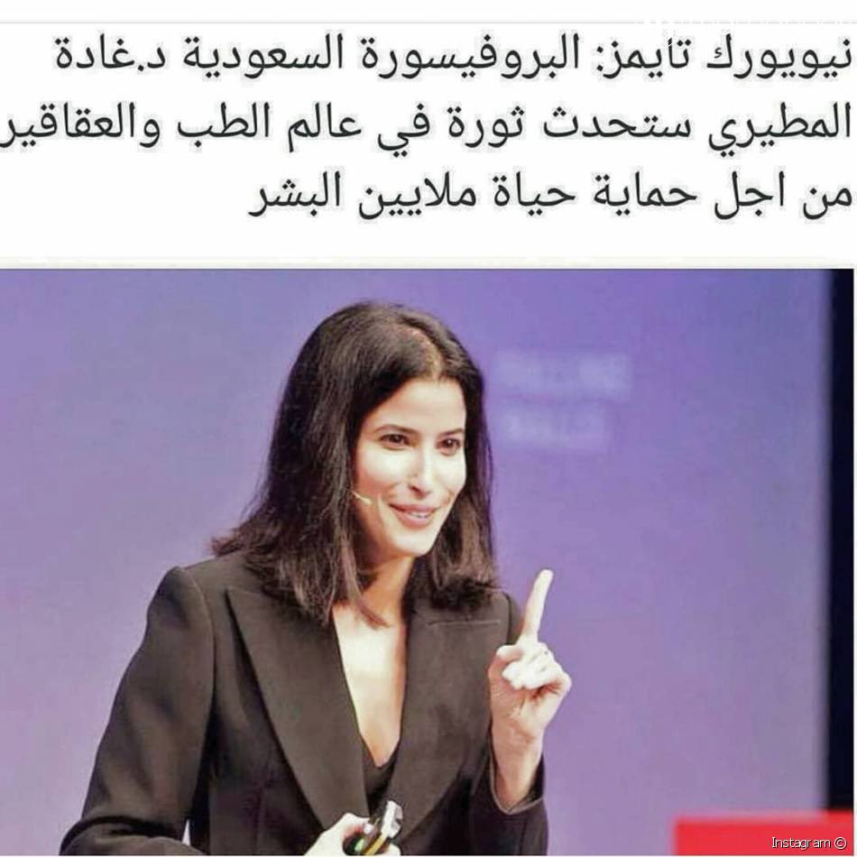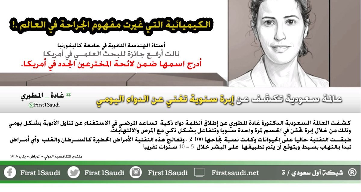 غادة المطيري، نالت أرفع جائزة للبحث العلمي بأمريكا،تترأس مركز أبحاث بجامعة كاليفورنيا ،عملت على تغيير مفهوم الجراحة في العالم وقالت عنها النيويورك تايمز انها ستحدث ثورة في عالم الطب.