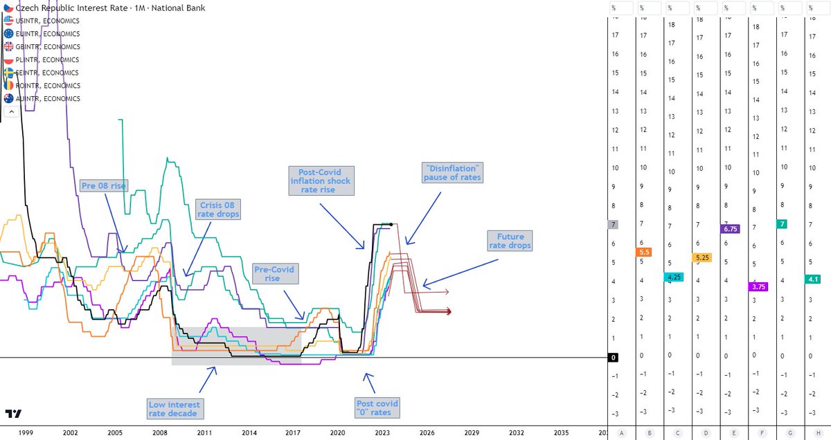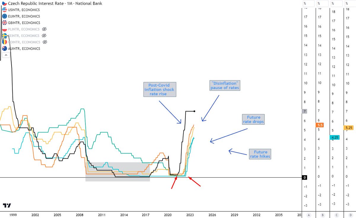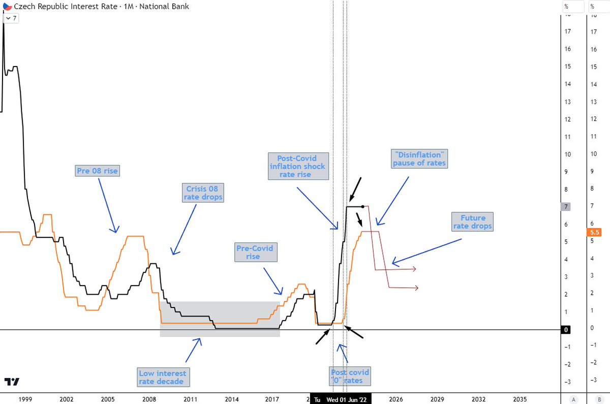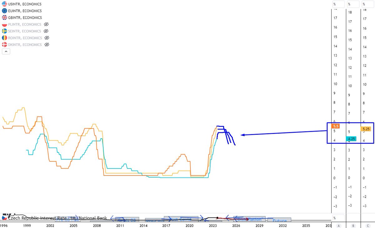 If we take in the 1-year lag and assume that this was the last rate hike in July, FED probably keeps the funds rate the same for the next year at 5.5% just like CZE