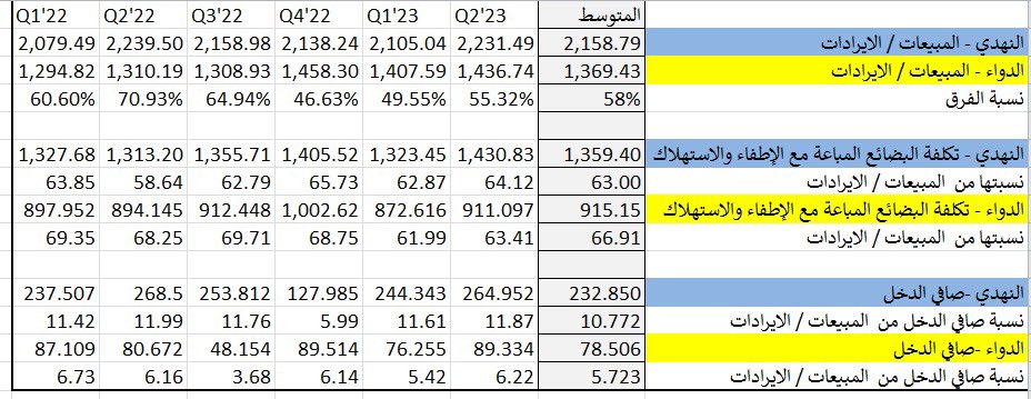 (التوقعات المستقبلية) خلال السنوات القادمة للشركتين كلها جيدة، نمو في المبيعات والارباح بنسب متقاربة، مع تفوق بسيط بنمو المبيعات للنهدي، هذا يعني ان العين لن تعلو على الحاجب في المستقبل.