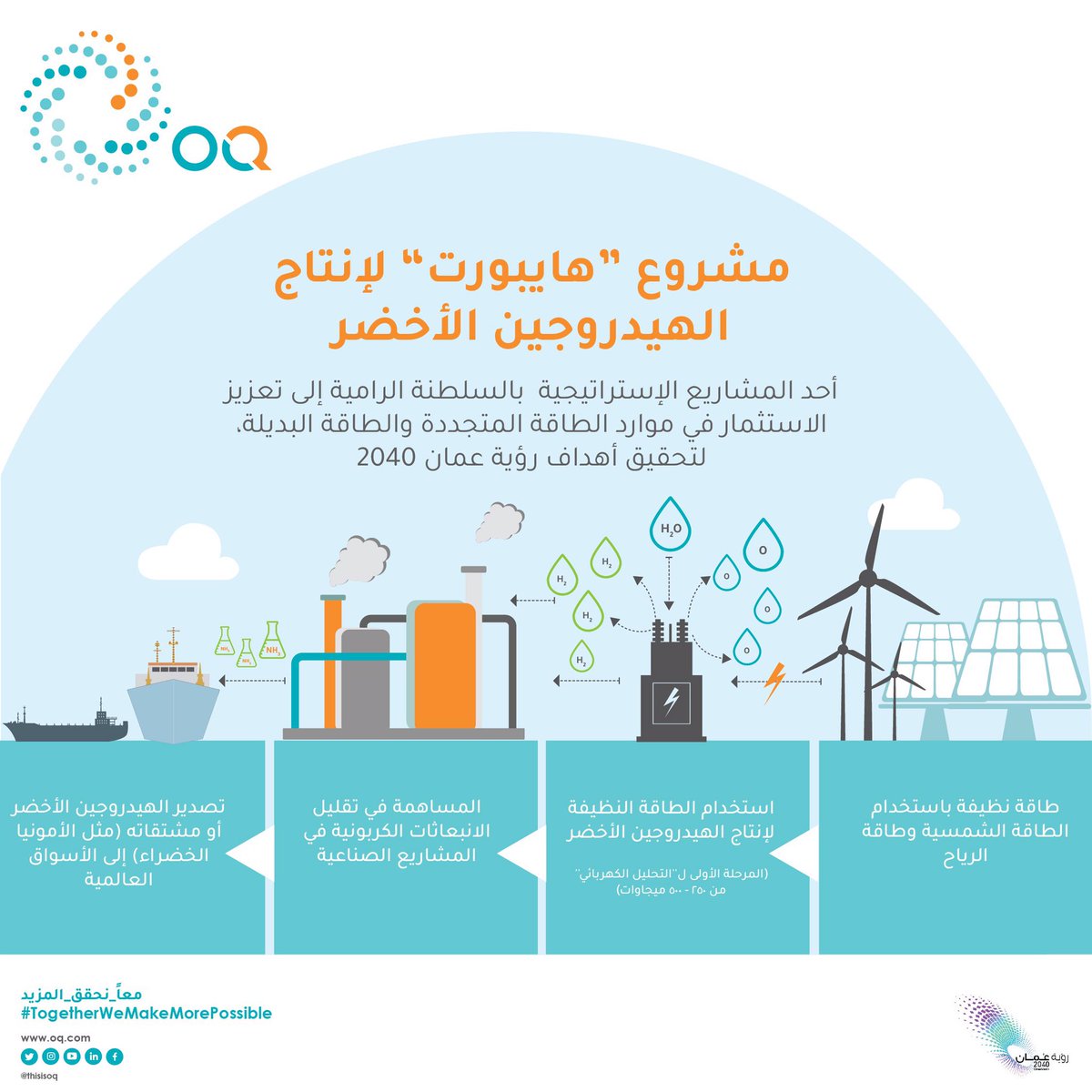 ووفقًا لوكالة الطاقة الدولية، تتمثل أهداف الإنتاج بالوصول إلى مليون طن بحلول عام 2030، وهذا من شأنه أن يجعل #سلطنة_عُمان سادس أكبر مُصِدر للهيدروجين في العالم، وبحلول عام 2040 من المتوقع أن تصل هذه الصادرات إلى 80% من صادرات السلطنة الحالية من الغاز الطبيعي المسال.