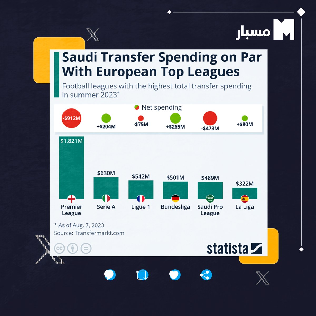🔵في المقابل، تمر كرة القدم السعودية بفترة استقرار إداري، وتُلعب المباريات وسط حضور جماهيري كامل، وحسب تحليل نشره موقع ستاتيستا المتخصص في جمع البيانات، فإن الإنفاق الحالي لأندية #الدوري_السعودي أصبح على قدم المساواة مع الدوريات الأوروبية الكبرى