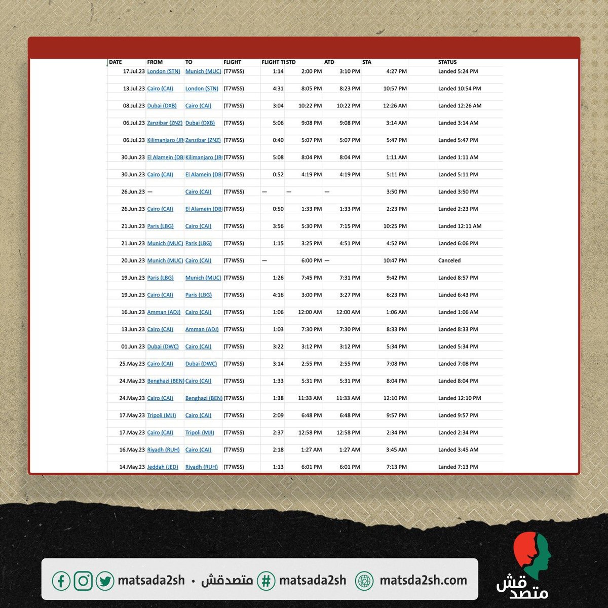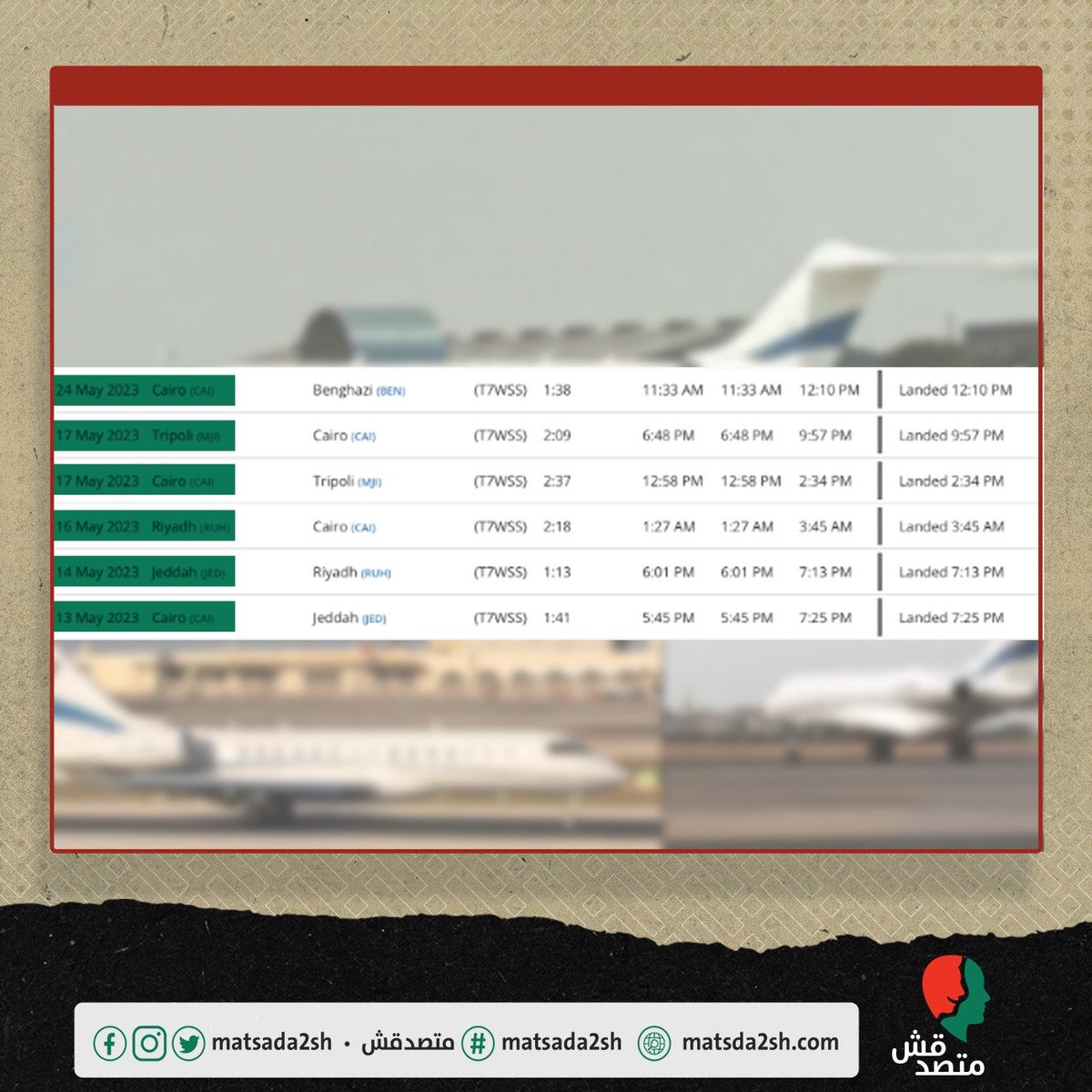 ◾ حصلنا على تاريخ رحلات الطائرة المسجل خلال العامين الماضيين عبر خدمة @flightradar24 لتتبع رحلات الطيران.
