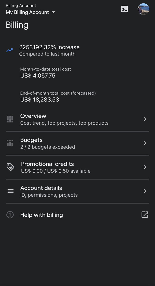 راسلت الدعم الفني في قوقل وبلغوني انه تم الغاء الفاتورة. بالمقابل بحثت عن كيفية ايجاد حل بحيث الخدمة ما تتوقف فوجدت ان الموضوع ليس سهلا أبدًا وما زلت ابحث. في الصور نصائح من قوقل للحماية من هذه المشكلة + هذا الموضوع stackoverflow.com