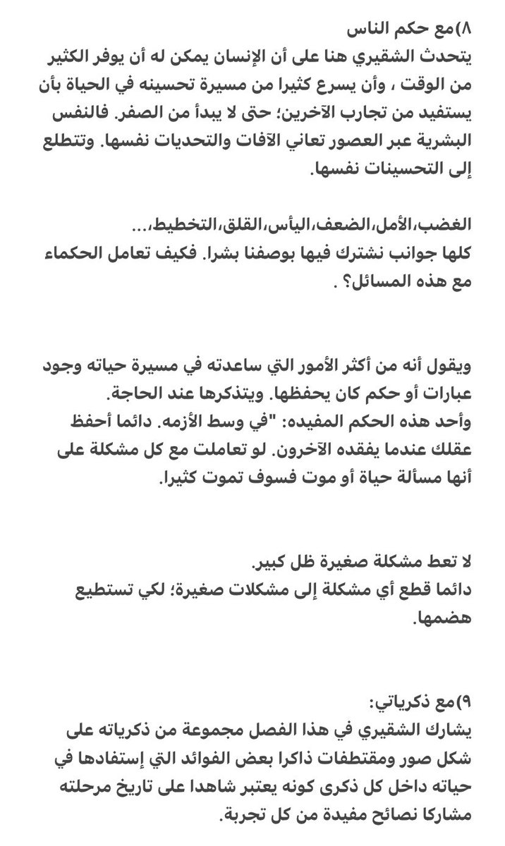 في الفصل الأخير كتب الشقيري بعض معتقداته الخاصة حول قوانين الحياة وهي نتيجة تجاربه والأطلاع على تجارب الآخرين وأفكارهم في عبارات قصيره وكلها لها أصول في التاريخ البشري وفي كتابات الناس المختلفة مثل حكمة:" لا تنافس الناس. نافس نفسك ليكون يومك أحسن من أمسك.