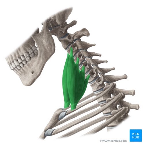 عضلات Scalenes تساعد في رفع الأضلاع العلوية للتنفس وتساعد في حركة الصدر والكتف بشكل عام، وفي حالات الشد العضلي لها راح يتسبب بسحب الرأس للأمام واللي فالغالب نقول عنه متلازمة حمل الرأس للأمام (FHC Forward Head Carriagg).