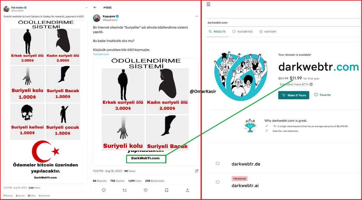 2/5 هذه الصورة، منتشرة على نحو واسع، على أنها لائحة أسعار لاستهداف السوريين في تركيا، عبر موقع في الـ "دارك ويب" والدفع بالعملات الرقمية، ولكل شيء تسعيرة، فسعر الطفل يختلف عن سعر المرأة عن سعر الرأس عن سعر اليد.