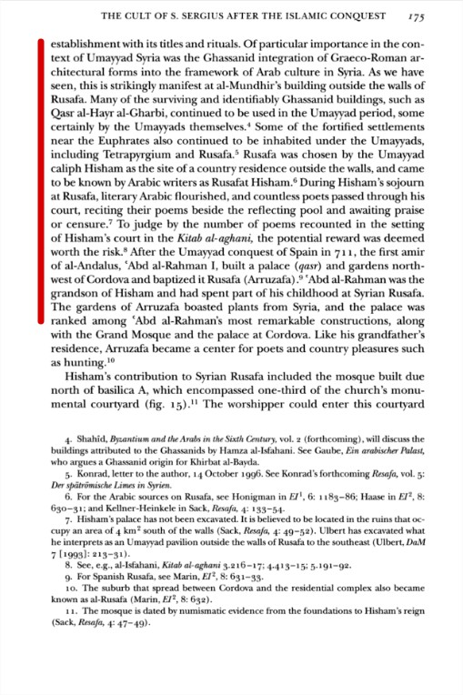 معمار الغساسنة والأمويين، مثل قصر الحير الغربي. فقد بنى عبد الرحمن الأول في قرطبة قصرًا سمي "الرصافة" على اسم مدينة الرصافة في سوريا. كانت الرصافة من أهم مدن الغساسنة.