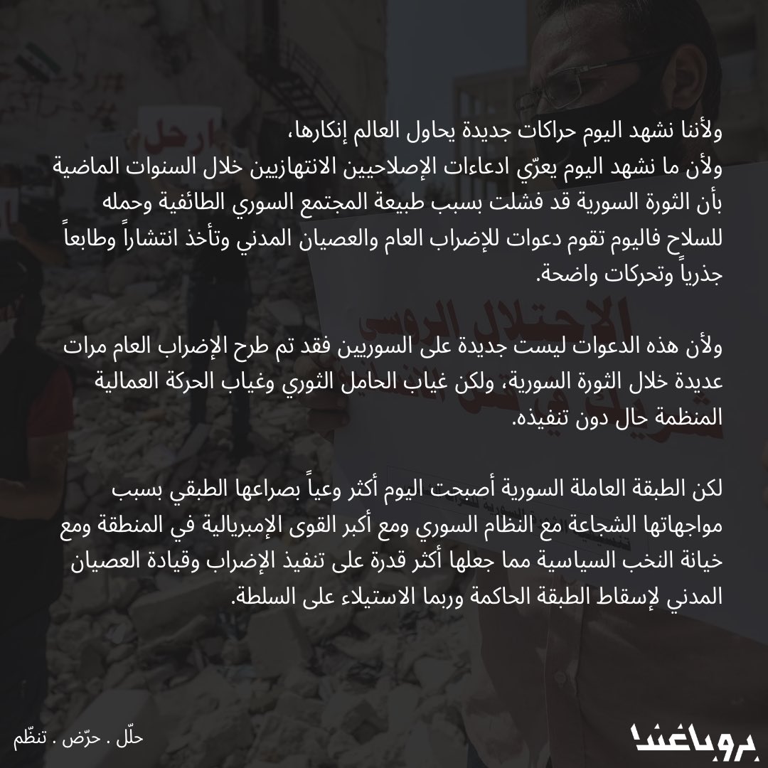 الطريق الوحيد لنجاح الإضراب وسقوط الأسد، هي في التنظيم الثوري. حذارِ أن نخسر هذه المعركة ونعود للمساومة على الحلول الدولية التي لم تكن يوماً في مصلحتنا.