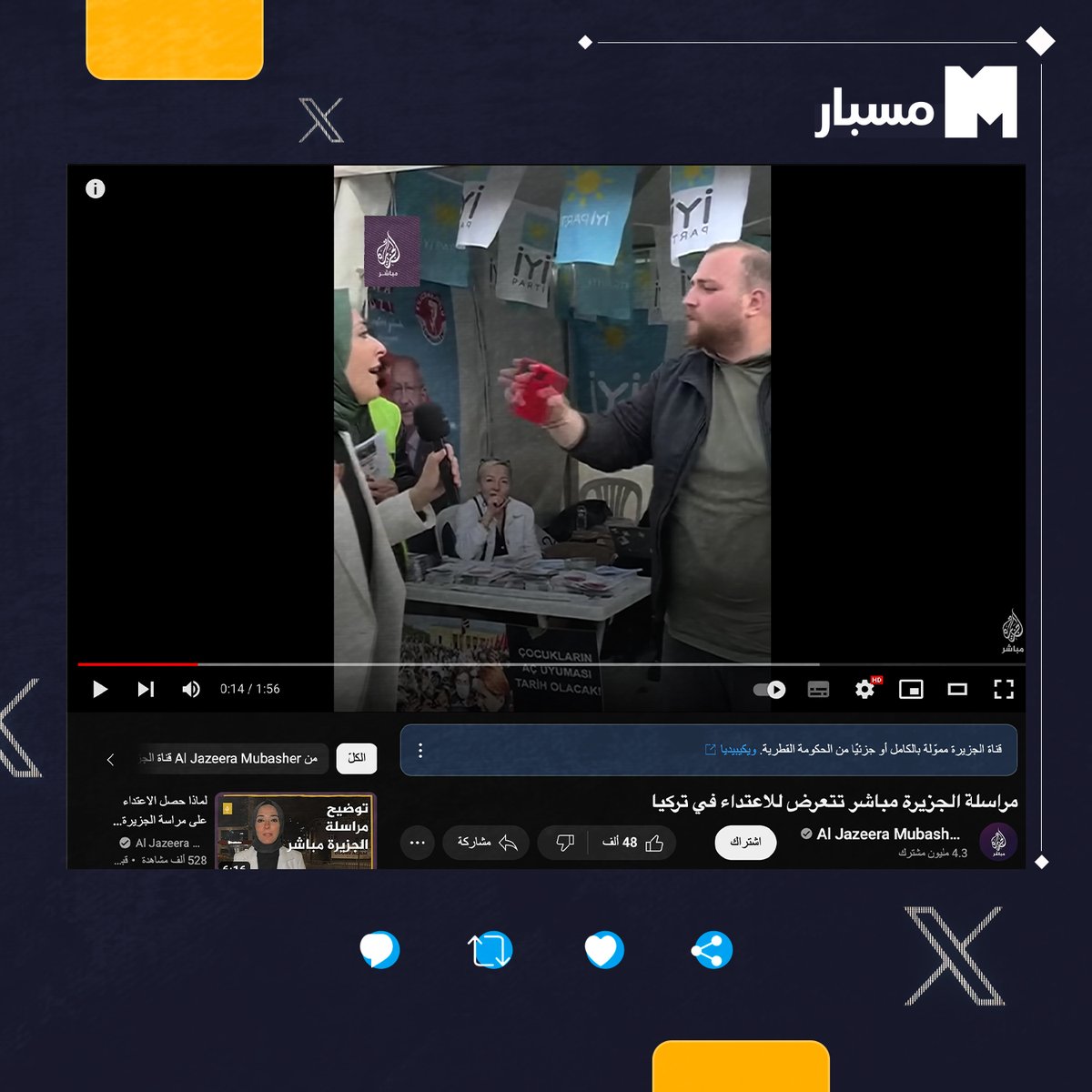 🔵 وفي 8 مايو 2023، اعتدى أحد مؤيّدي حزب "الجيد" على مراسلة الجزيرة مباشر، الإعلامية المصرية رُقيّة تشيليك، بعدما قاطعها خلال بث مباشر وطالبها بعدم التحدُّث باللغة العربية، ذلك أثناء قيامها بجولة في إسطنبول لرصد أجواء الحملة الانتخابية، كما حاول شخص منع توثيق الحادثة