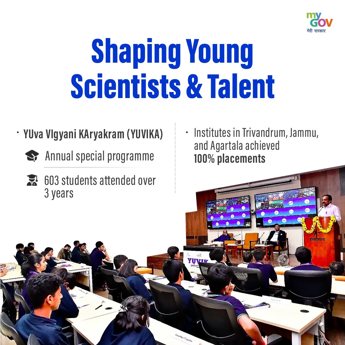 Annual special program shaping future scientists. 603 students attended in 3 years, with 100% placements at Trivandrum, Jammu, and Agartala institutes.