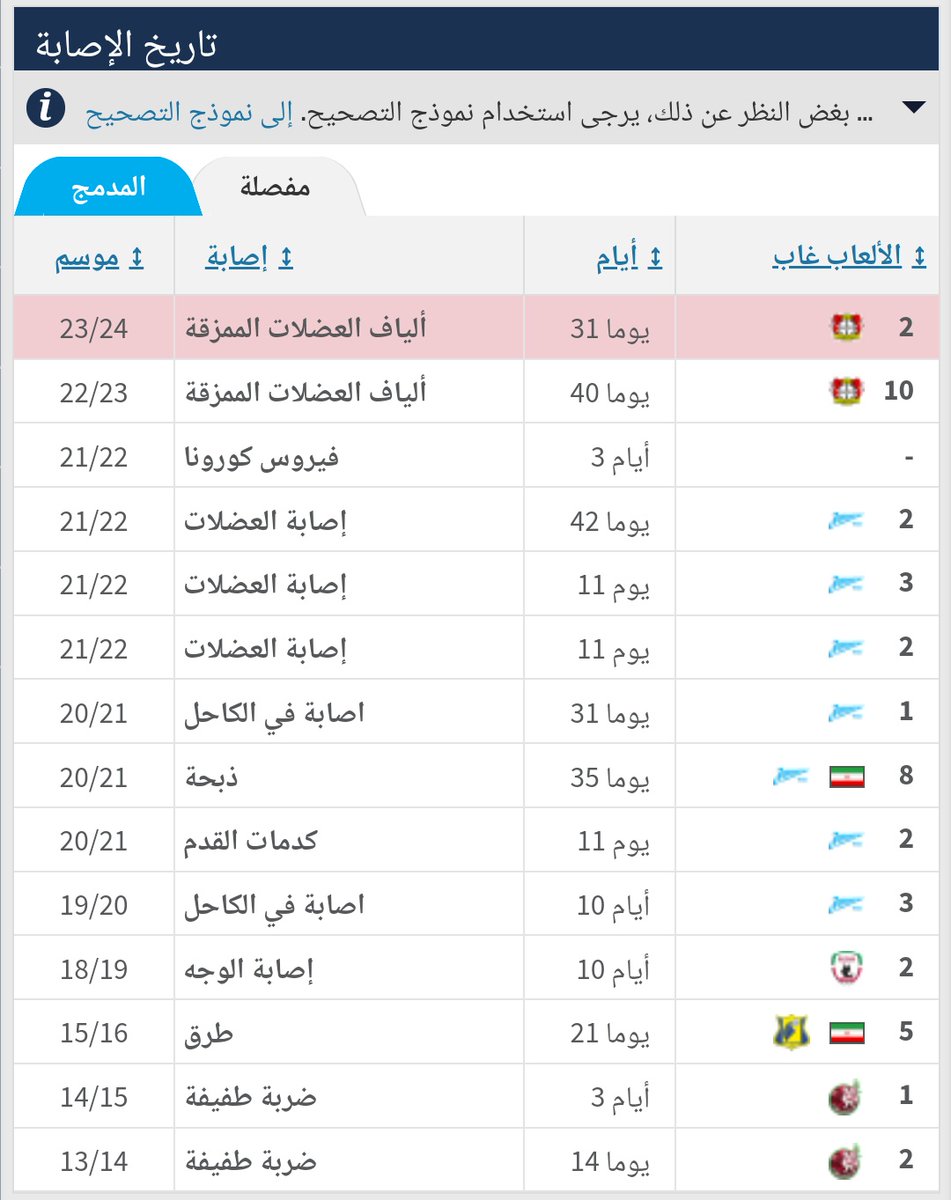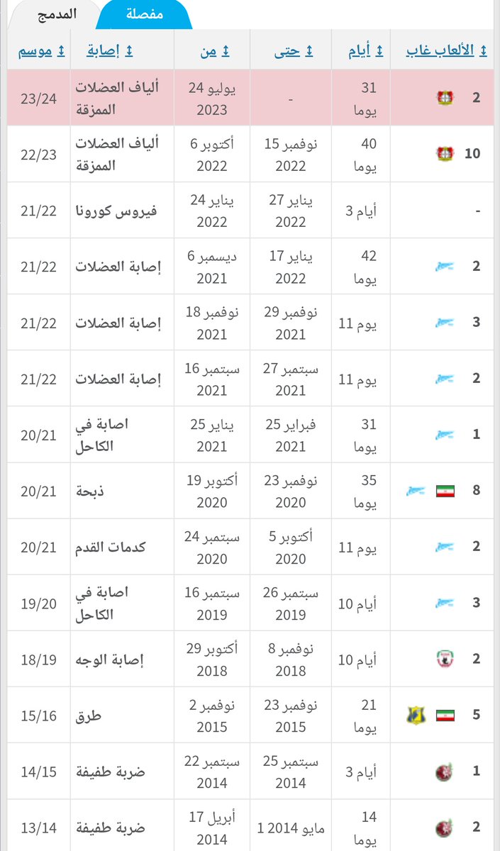 4️⃣ نختم التقرير بسجل إصابات المهاجم سردار آزمون 🇮🇷🤕