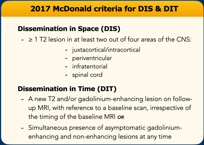 وبالمثل، فإن الانتشار في الوقت المناسب يعني أن الضرر العصبي يحدث في أكثر من نقطة زمنية واحدة. ويمكن إثبات ذلك إما من خلال تفاقم المرض الثاني، أو ظهور آفات جديدة في فحوصات التصوير بالرنين المغناطيسي، أو من خلال أدلة واضحة على تلف الدماغ الذي حدث في أوقات…