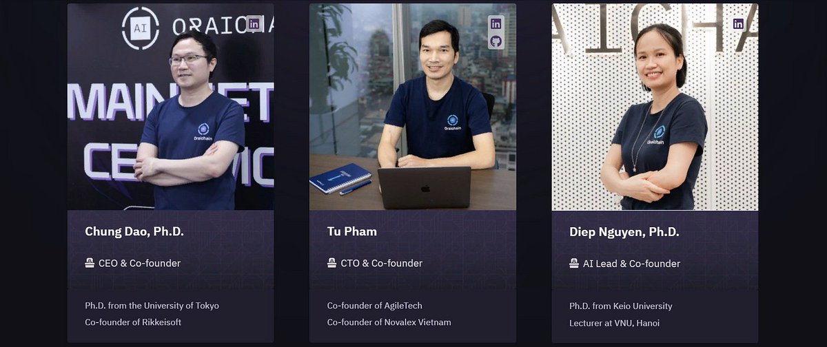 نحو عصر جديد يجمع مابين الـ Blockchain و الـ AI يجمع فريق Oraichain بين متخصصي Blockchain وعلماء البيانات والمهندسين والمستشارين و المطورين في جميع أنحاء العالم ولدى Oraichain أكثر من 50 شخص معظمهم يقيم في Vietnam والعديد من الأشخاص في USA وSingapore وEU