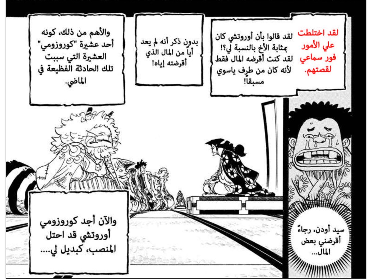 اودين اتخذ الخيار الافضل بالنسبة له بعد مقاتلته مع كايدو، لأنه حينها علم قتال مع هذا الشخص حتى لو فاز سيسبب خسائر فادحه لوانو، ولذلك اخذ مثل هذا الوعد سيضرب عصفورين بحجر واحد، الاول سينقد آهالي وانو والثاني سيعتذر لعشيرة الكورزومي..فكان يظن ان القراصنة في وعودهم امثال روجر…