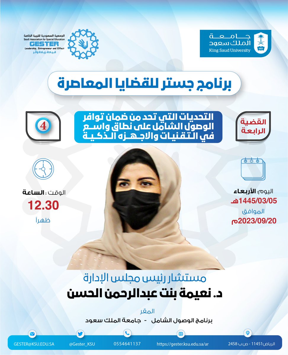 #القضية_الرابعة من برنامج جستر للقضايا المعاصرة بعنوان:"التحديات التي تحد من ضمان توافر الوصول الشامل على نطاق واسع في التقنيات والأجهزة الذكية"