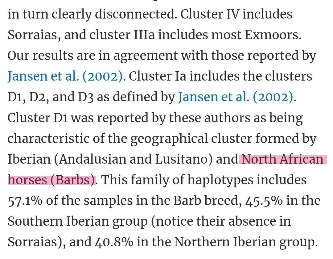 ▪︎و للتاكد من النتيحة اخذوا من عدة مواقع معينة لتأكيد العلاقة التي يحملها الحصان الاندلسي بين السلالة الاوروبية و المحلية الايبيرية ثم #الشمال_إفريقية ، وفق دراسة ""Jansen et al. 2002"" ، و بالتالي انتم تعرفون ماذا يعني هذا الكلام ق١دضاء مضجع الأعراب !