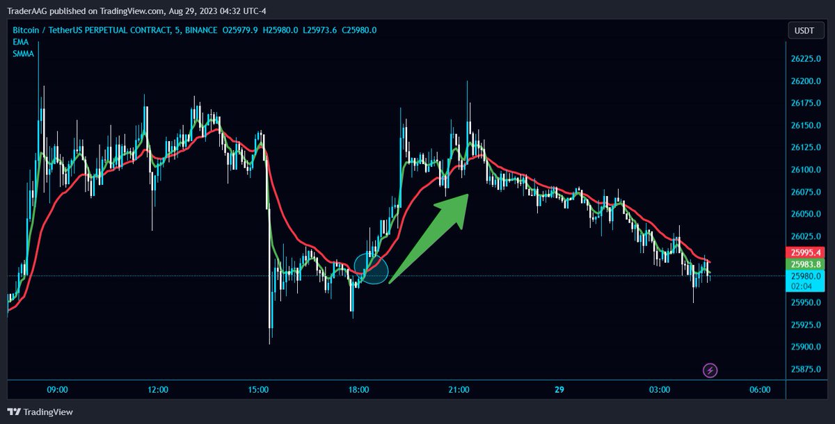 1. Wait for the 5-period EMA to cross above the 10-period SMA. This indicates a potential short-term uptrend.