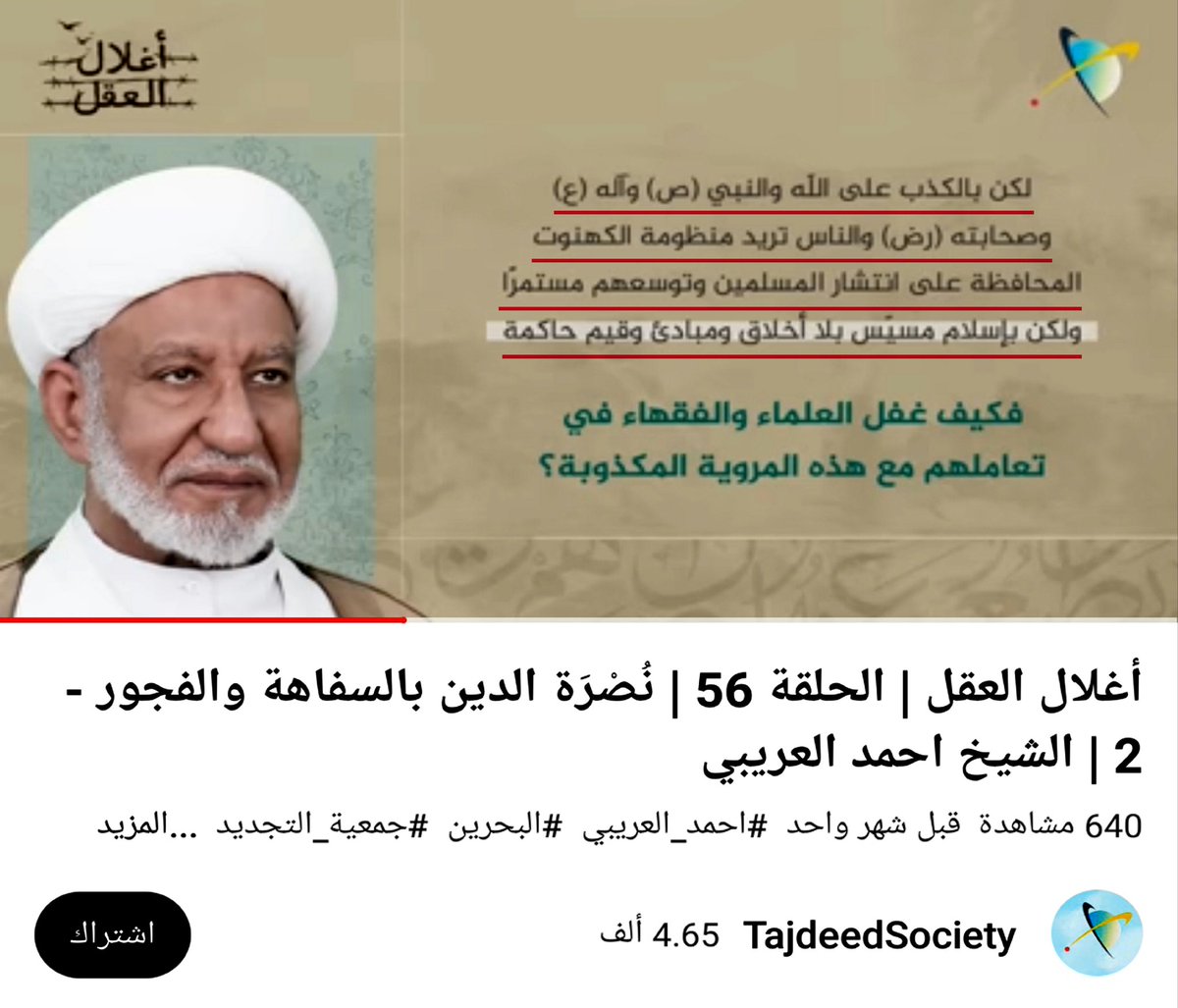 قال العريبي في الدقيقة ١١: (لكن بالكذب على الله والنبي (ص) وآله (ع) وصحابته (رض) والناس تريد منظومة الكهنوت المحافظة على انتشار المسلمين وتوسعهم مستمراً ولكن بإسلام مسيس بلا أخلاق ومبادئ وقيم حاكمة)