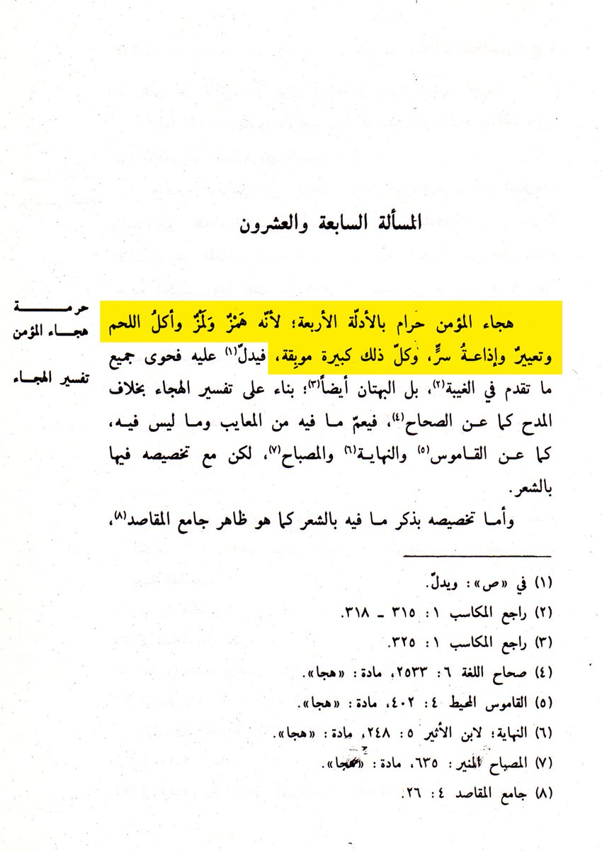 قال الشيخ الأنصاري في المكاسب ج٢ ص١١٧: (هجاء المؤمن حرام بالأدلة الأربعة: لأنه هَمْزٌ ولَمْزٌ وأكل اللحم وتعييرٌ وإذاعة سرّ، وكل ذلك كبيرة موبقة)