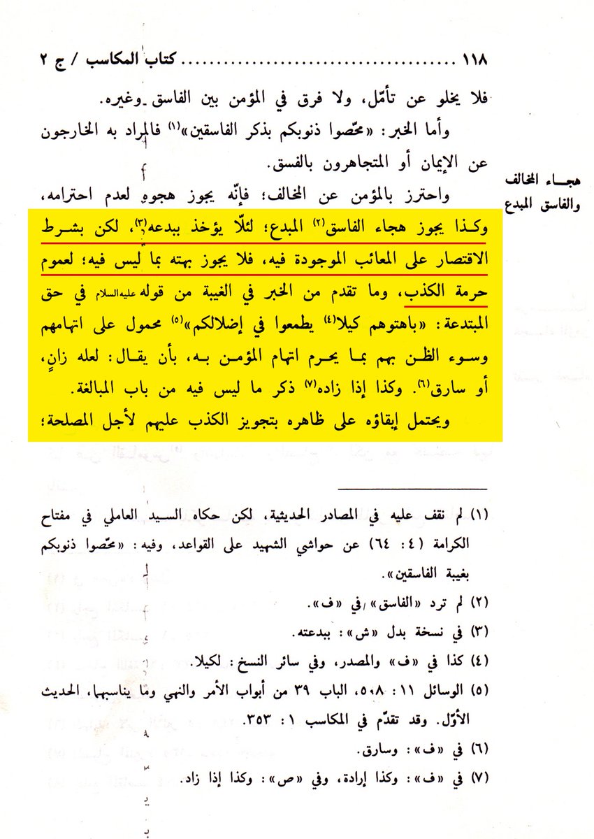 قال الشيخ مرتضى الأنصاري في المكاسب ج٢ ص١١٨ قبل الفقرة التي نقلها العريبي مباشرة: (وكذا يجوز هجاء الفاسق المبدع؛ لئلّا يؤخذ ببدعه، لكن بشرط الاقتصار على المعائب الموجودة فيه، فلا يجوز بهته بما ليس فيه؛ لعموم حرمة الكذب).