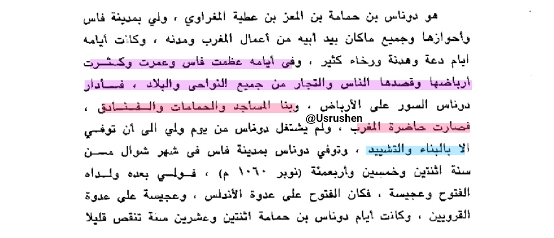 ▪︎فيحدثنا ابن ابي زرع في (الخبر عن دولة الأمير دوناس ) ، :"" و في أيامه #عظمت_فاس و عمرت و #كثرت_رياضها و قصدها الناس و التجار من جميع النواحي و البلاد ، فأدار دوناس السور على الأرياض، و #بنا المساجد و #الحمامات و #الفنادق فصارت #حاضرة_المغرب "" ، اي ان قبلها فاس لم تكن متحضرة!