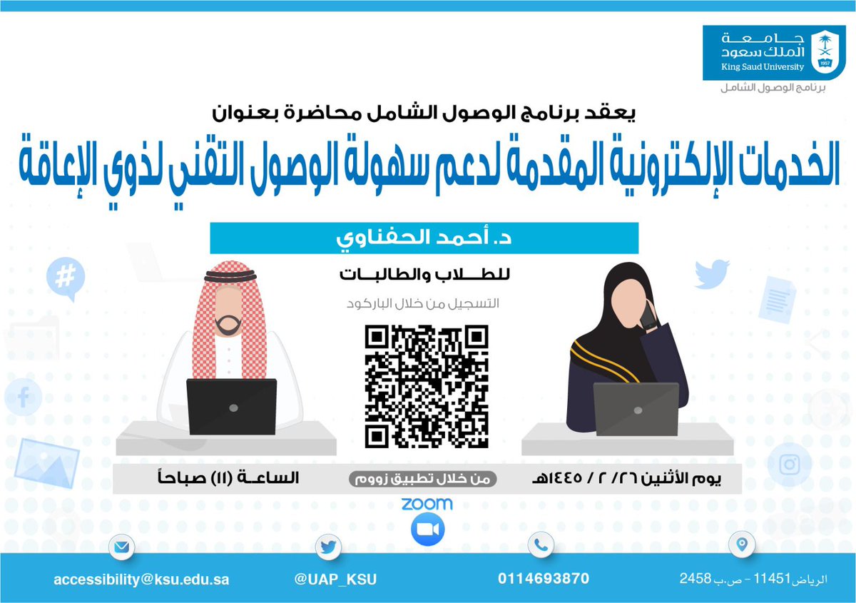 محاضرة في الوصول التقني: من ضمن المحاضرات يعقد #برنامج_الوصول_الشامل محاضرة بعنوان "الخدمات الاالكترونية المقدمة لدعم سهولة الوصول التقني لذوي الاعاقة " يوم الاثنين الموافق 11/9/2023 الساعه 11 صباحاً للتسجيل: forms.gle