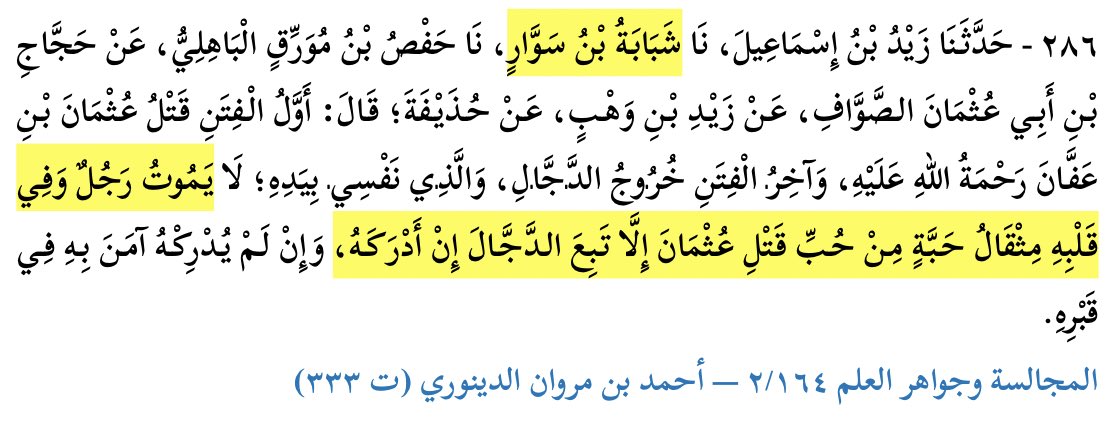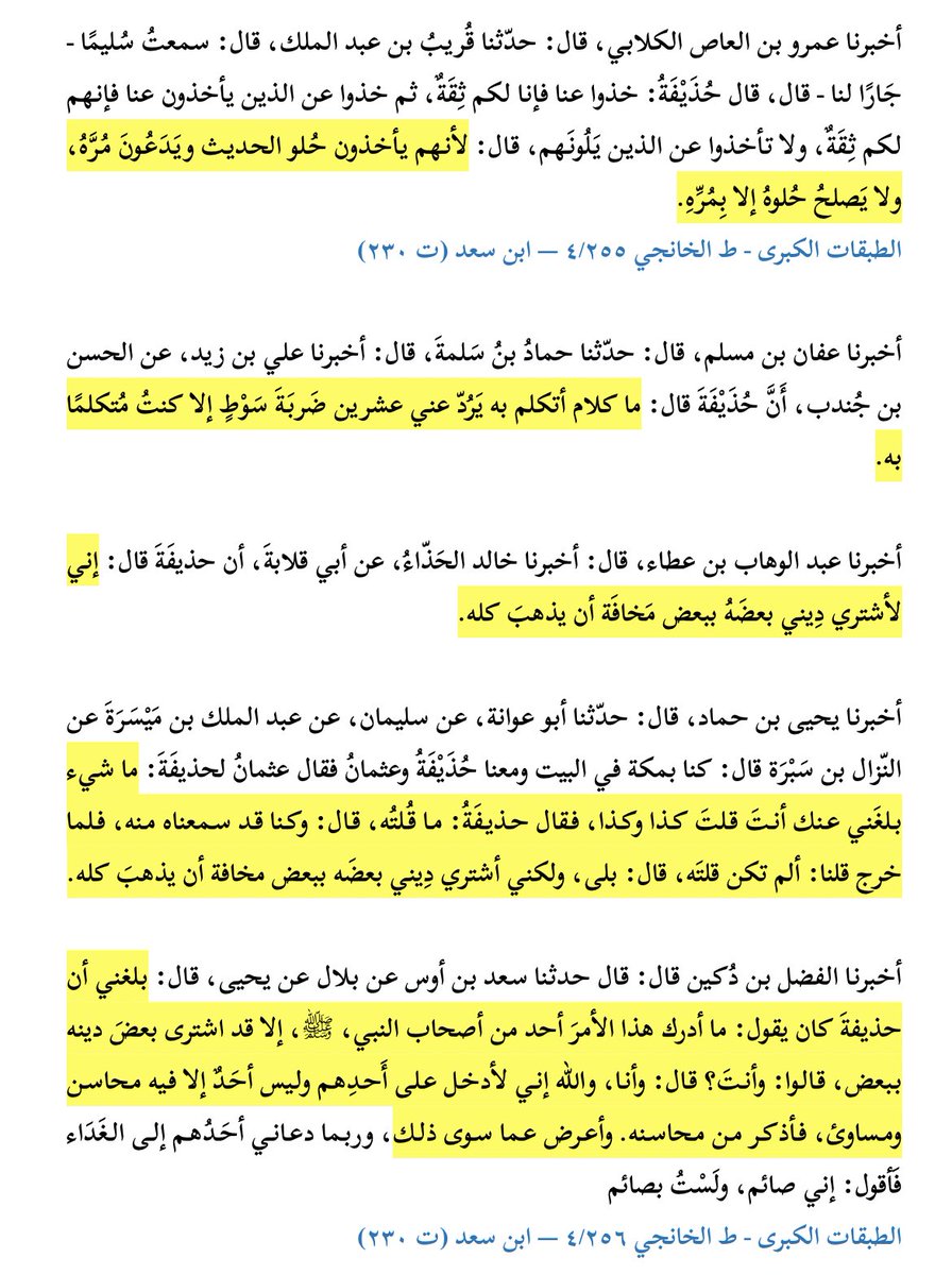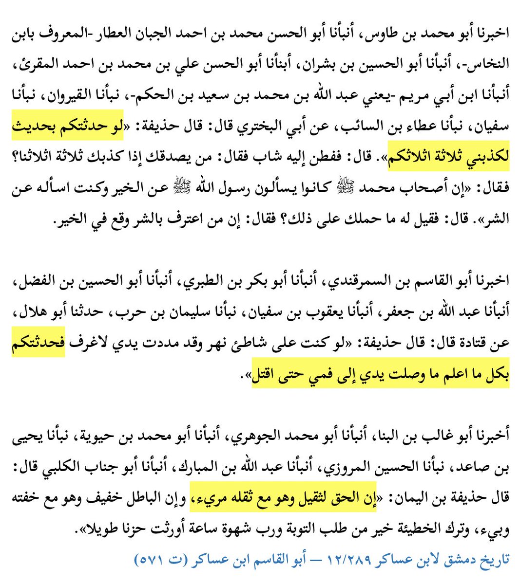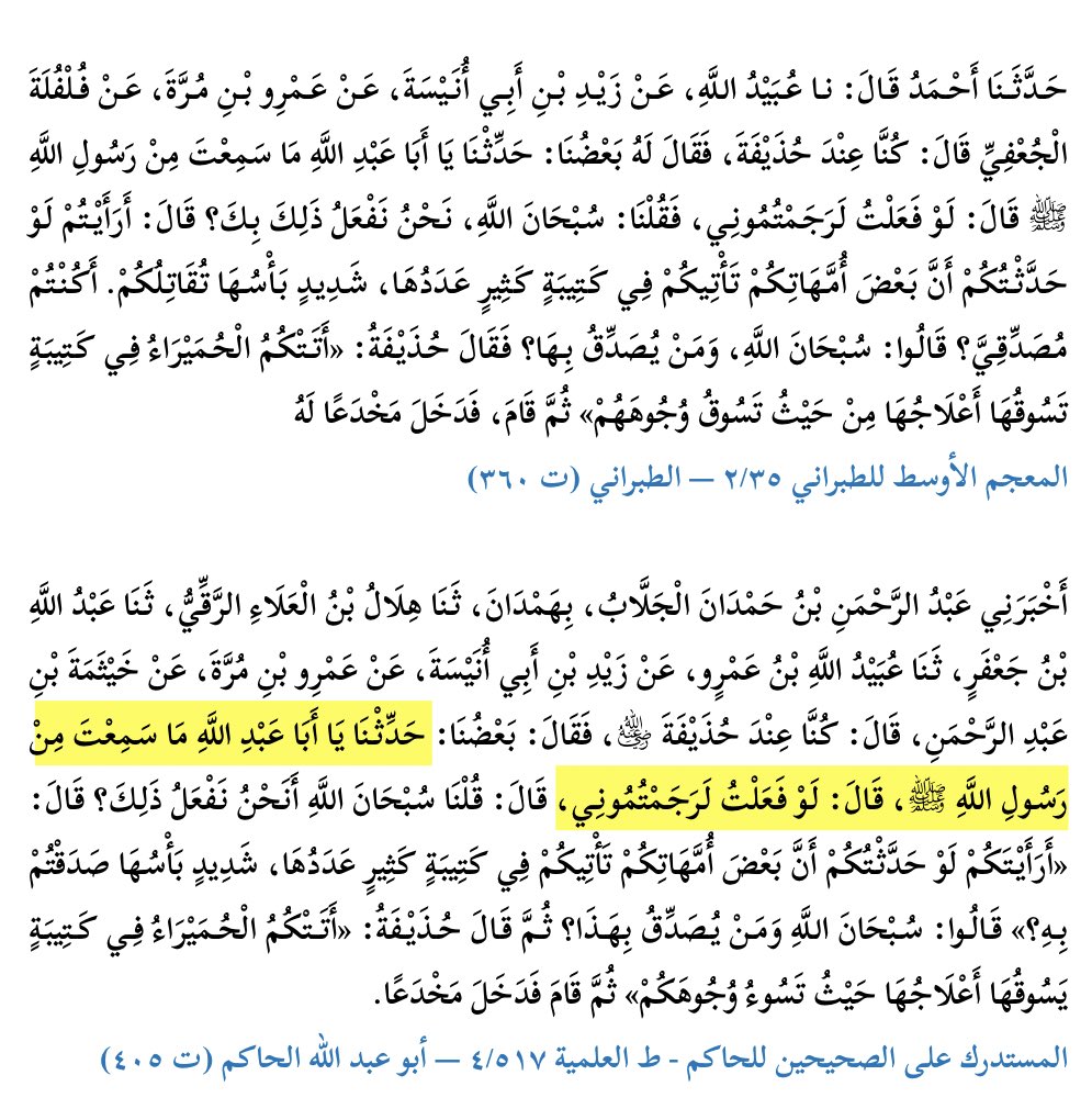 ومن المعاصرين الشيخ @saltaweel أنكر معنى هذا الحديث -مع أنه لم يبحث إسناده إن كان صحيحاً أم لا-، زاعماً أن تبشير عمر بالجنة يناقض هذا الخبر، وهذا حق، لكن كان من المفترض أن يشك في تبشير عمر بالجنة لا في ما صح عن حذيفة، لا سيما مع تعدد القرائن والشواهد لحديث حذيفة.
