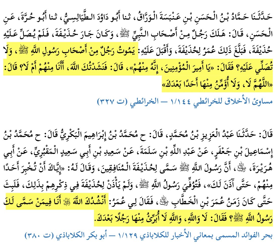 وأيضاً الدكتور @DrAdnanIbrahim ضعّف الحديث عن حذيفة، وصحح الحديث المروي عن أم المؤمنين أم سلمة، لأن أم سلمة ليست مشهورة بأن ما تعلمه يخص أهل العقبة، على عكس حذيفة! ود. عدنان يعلم هذا الأمر، فمجرد تصحيح هذا الخبر يجعل عمر في قفص الاتهام بمحاولة اغتيال النبي ﷺ!