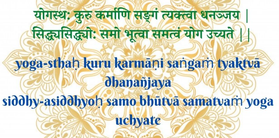 yogasthaḥ kuru karmāṇi saṅgaṃ tyaktvā dhanañjaya | siddhy-asiddhyoḥ samo bhūtvā samatvaṃ yoga ucyate || 2:48 ||