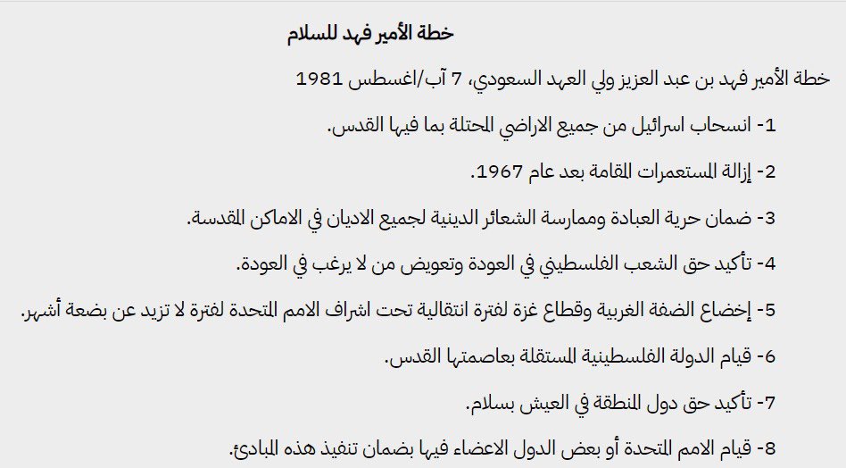 وسط جمود سياسي عربي استمر لعقود تجاه إسرائيل، ألقى ولي العهد السعودي حينها الأمير فهد بن عبد العزيز حجراً في المياه العربية الراكدة، بحثاً منه عن آفاق جديدة وبدائل رحبة، حيث أدلى بتصريح لوكالة الأنباء الرسمية السعودية في صيف 1981، حول ما أسماه رؤية المملكة للسلام في الشرق الأوسط.