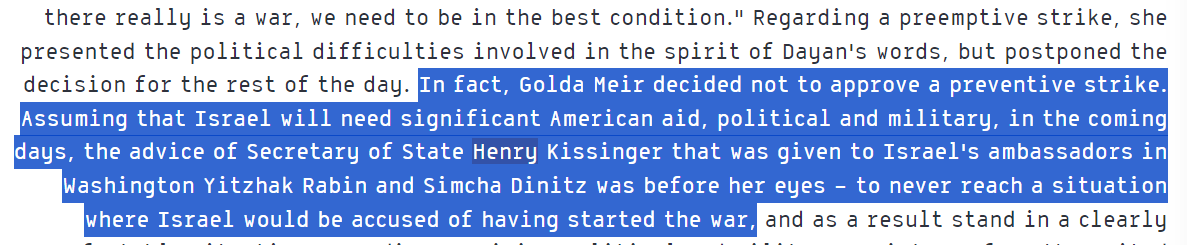 ولكن اسرائيل تراجعت عن فكرة الضربة الإستباقية لأن أمريكا وعلي لسان " هنري كسينجر " حذرهم بشكل قاطع من إنهم يبدأو الحرب لأن دا هيمنع أمريكا من تقديم الدعم السياسي والعسكري لاسرائيل.