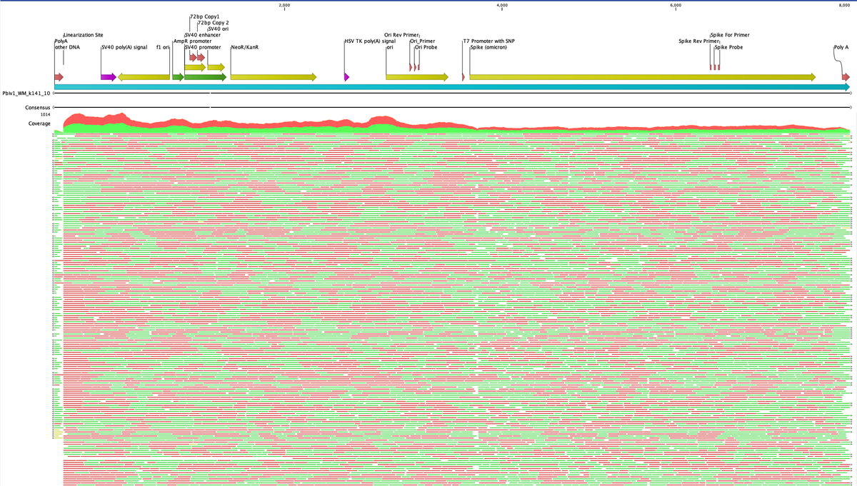 1. Ci sono circa 2 miliardi di copie del frammento contenente l'origine della replicazione e, dall'analisi della sequenza dei nanopori, ci sono probabilmente 50-100 volte più pezzi di DNA plasmidico derivati dall'intero vettore.