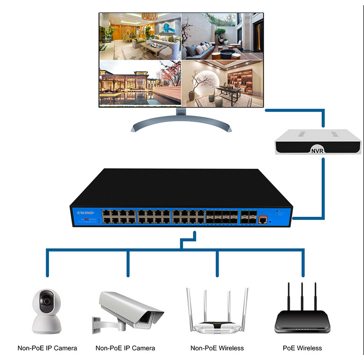 النوع الثاني No-PoE وهو جهاز لا تتصل الكاميرات به مباشرة، بل يتم توصيل الكاميرات جميعها بموزع (سويتش) ويكون موزع خاص للكاميرات الأمنية، ويستخدم هذا النوع اذا كانت الكاميرات بأماكن متباعدة وتريد جمعها في نقطة بعيدة ثم تمديد كيبل واحد فقط إلى جهاز التسجيل