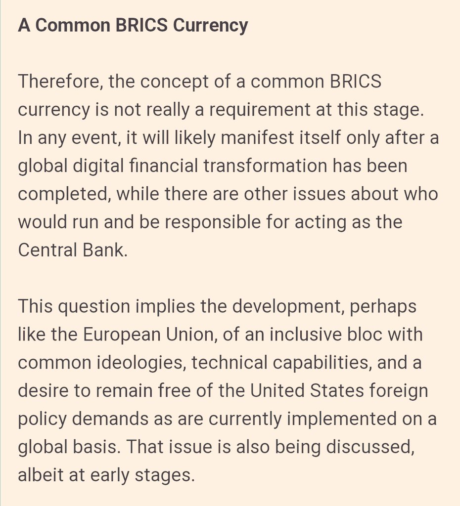 هدف اولیه بریکس، شکست انحصار دلار از روابط مالی بینالمللی و رهایی از نرمافزارهایی مانند سوئیفت برای شکستن تحریمهای بینالمللی اعلام شده است.