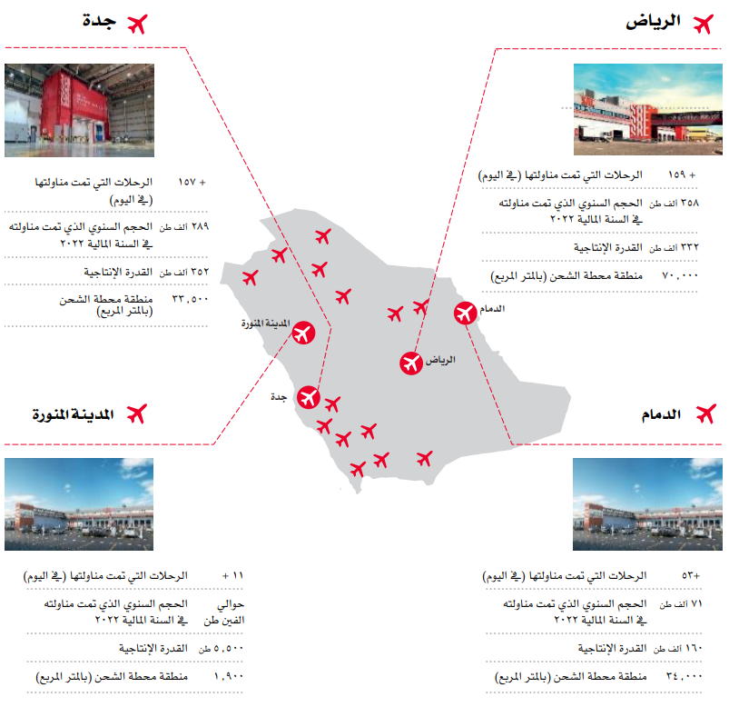 تبلغ منطقة محطة الشحن التابعة للشركة في مطار الملك عبدالعزيز الدولي حوالي 33٫500 م.2