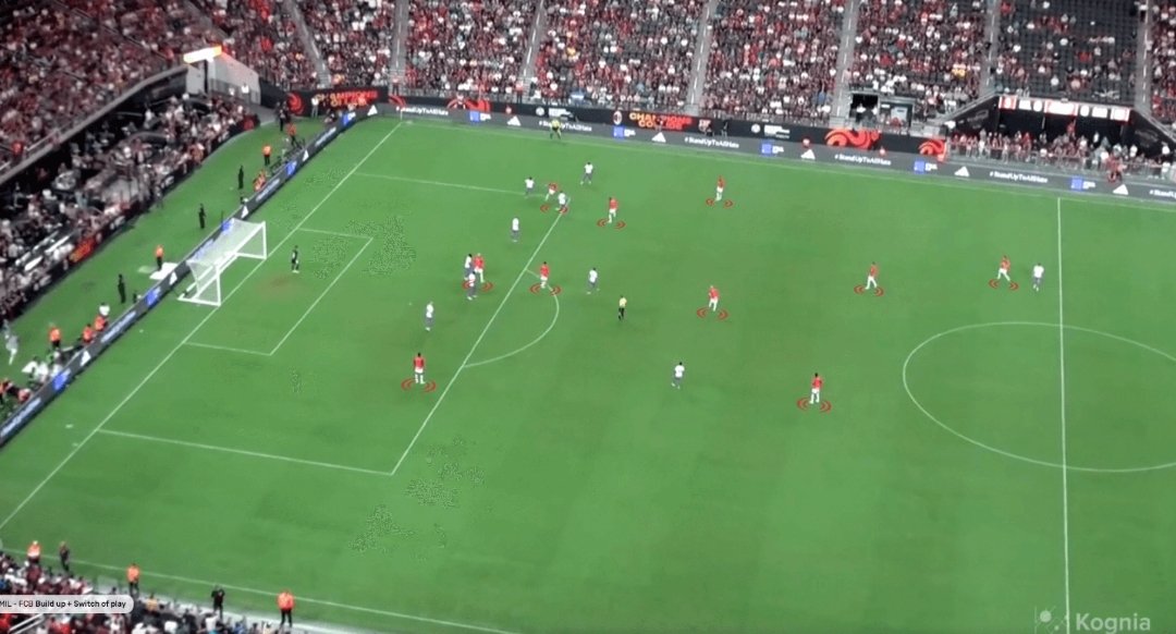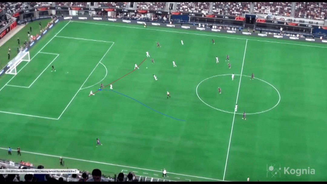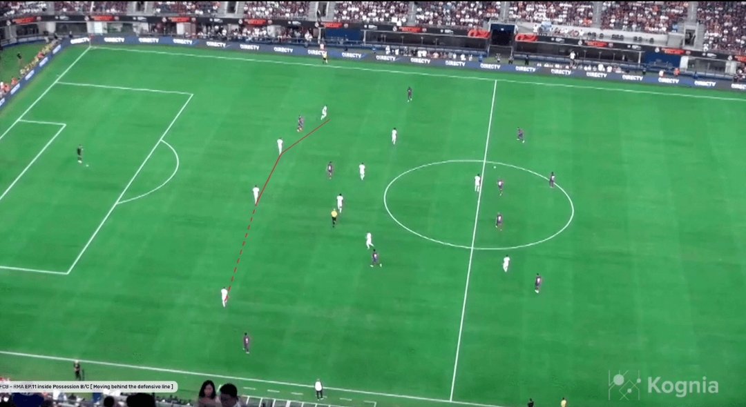 فاتي يحافظ على الكرة بينما يتراكم اللاعبون على جانب واحد من الملعب. على الجانب الآخر، يقرأ رافينيا الموقف جيدًا ويتحرك نحو الطرف الأيمن لفتح الملعب. ويأمر زميله فاتي بسرعة لنقل الكرة إلى المساحة الفارغة التي يركض نحوها.