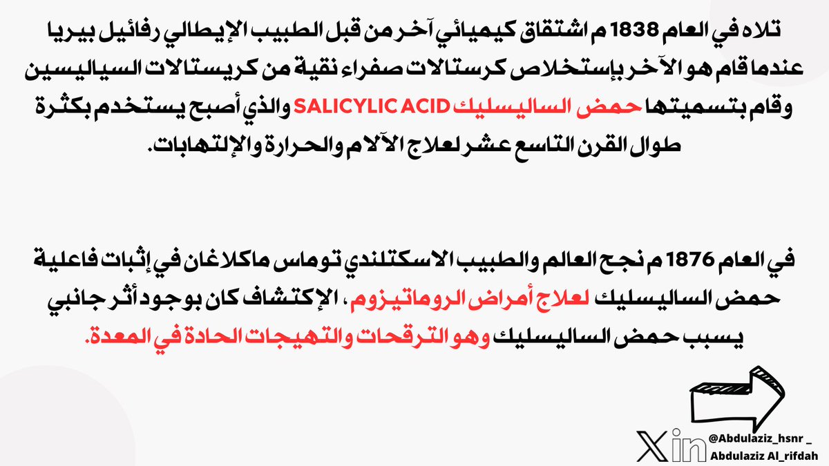 في المنشور المرفق قصة اكتشاف دواء الأسبرين وبدايته من شجرة الصفصاف إلى قصة عريقة وتاريخية لا زالت مستمرة منذ 4 آلالاف عام.