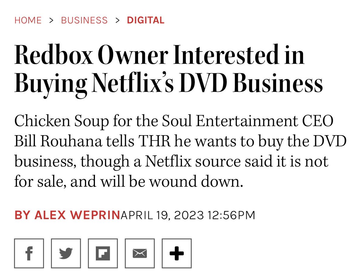 Ah turns out that Redbox tried 3-4x to buy Netflix’s DVD business but was rebuffed: hollywoodreporter.com