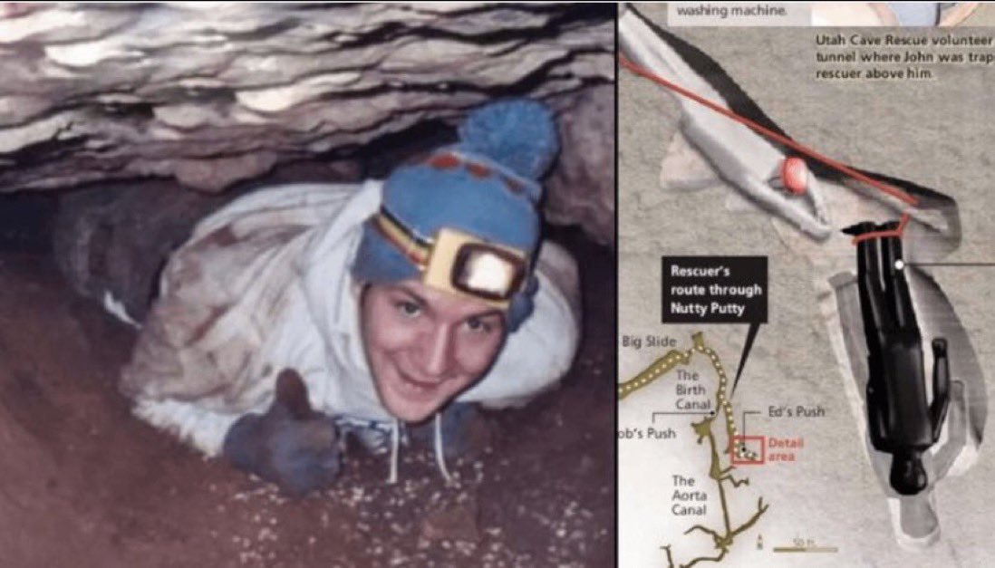 جون احد الاشخاص الي يحب يكتشف الكهوف والاماكن الضيقه جدا دخل كهفnutty Putty وكان ضيق جدا وتعلق فيه لمده 26 ساعه ورجال الانقاذ ماقدرو يطلعونه وناقشو على ان يسحبوه نفس الصوره لكن المصيبه راح ينكسر ظهره وساقيه لما يسحبوه واتفقو يتركونه يتوفى داخل الكهف كنوع من الرحمه له!