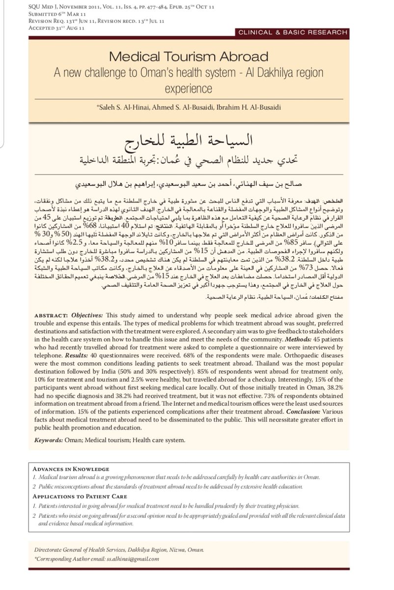 - في السلطنة، هناك دراسة أجراها د صالح الهنائي @SsAlhinai و د أحمد البوسعيدي مدير البرنامج الوطني لزراعة الأعضاء عن السياحة الطبية للخارج للعمانيين.