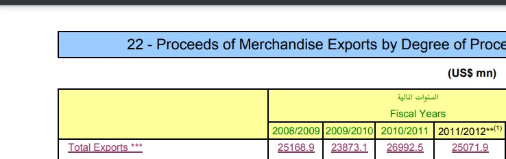 📌 وحققت صادرات مصر نحو 26.99 مليار دولار في 2010/ 2011، و25.1 مليار دولار في 2011/ 2012، ثم 25.97 مليار دولار في 2012/ 2013 مقارنة بـ23.87 مليار دولار في 2009/ 2010، بحسب بيانات البنك المركزي.