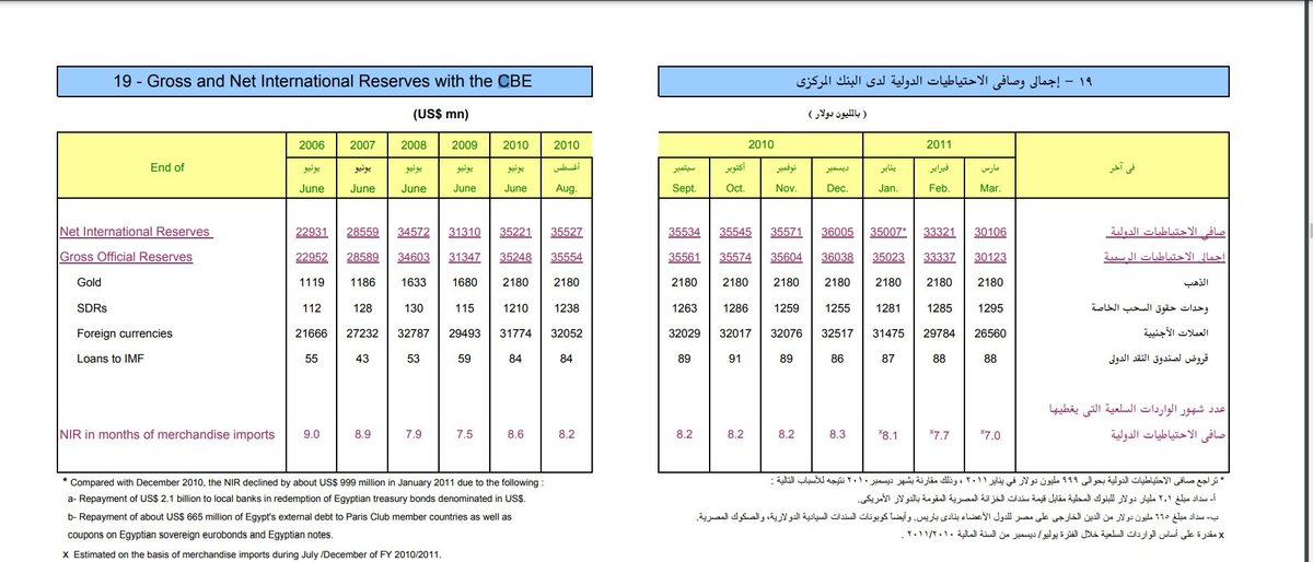 📌 تراجع احتياطي مصر من العملات الأجنبية من 35 مليار دولار في يناير 2011 إلى 15.55 مليار دولار في يونيو 2012، وفقًا لبيانات البنك المركزي.