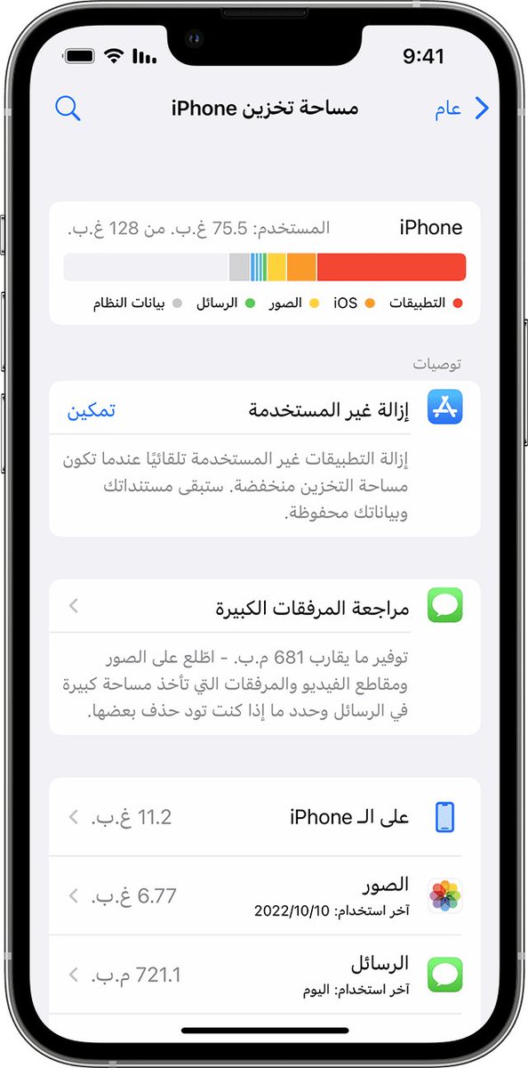 • الخطوة الثانيه : الاعدادات - عام - مساحة تخزين iPhone .. تطلع لك بعض التوصيات سواً في الصور أو حتى الفديوهات