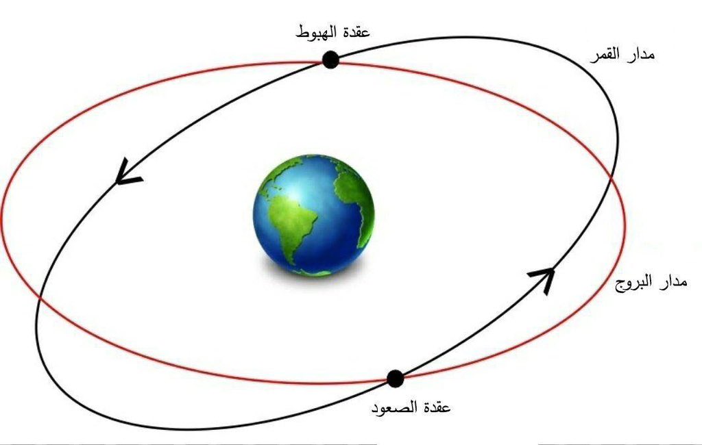 مدار القمر حول الأرض ليس مدارًا مستويًا، بل ينخفض ويرتفع خلال الشهر ثم يصل إلى نفس مستوى مدار الأرض مرتين بالشهر القمري🌏
