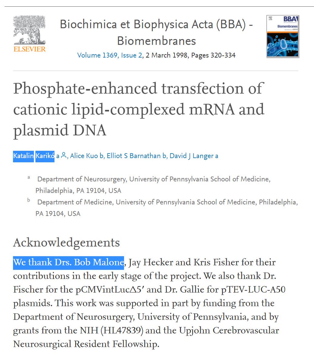 10. Per una serie di vicissitudini, Malone ebbe dei contrasti personali, non trovò i finanziamenti, e non riuscì a proseguire i perfezioni della tecnologia che fu portata avanti da un grande numero di ricercatori, fino ad arrivare a quelli definitivi fatti da Karikó e Weissmann.
