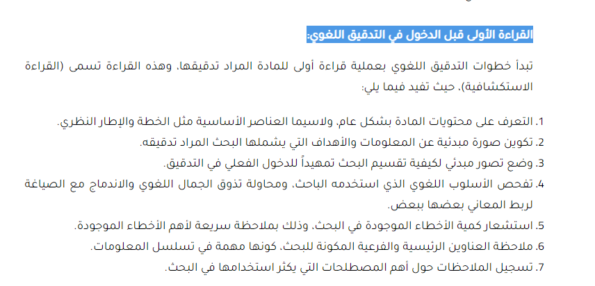عندما تنتهي من كتابة رسالتك العلمية، لابد من القيام بالتدقيق اللغوي للوقوف على الأخطاء اللغوية والنحوية وأخطاء الصياغة التي ربما وقعت فيها.