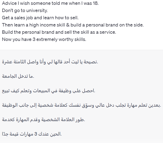 ويمكن تلاقي أدوات ذكاء اصطناعي غير ChatGPT تطلع مع الوقت للترجمة بدقة، لكن أتكلم عن تجربتي الحالية إنه الترجمة رهيبة!